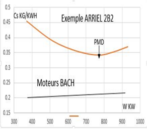 • A gas turbine does not have the same efficiency at partial load as a piston engine. It is more expensive than its piston equivalent in use (consumption) and maintenance. But its advantages, efficiency at maximum load, greater power possibility, become interesting > 800 KW. Hence the choice of the BACH motor® range: 100 to 800 KW.
