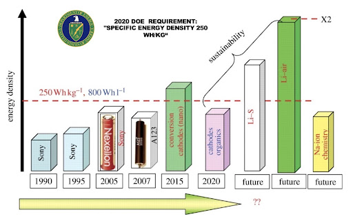• New technologies in development (Li-S – Li-Air-Na-ion… solid electrolyte batteries). Being developed for aerospace applications, they have higher energy density potential than current lithium-ion batteries, with improved safety and longer life. Solid-state batteries also have the potential to address the operational safety issues of lithium-ion batteries, eliminating their fire or explosion risks.